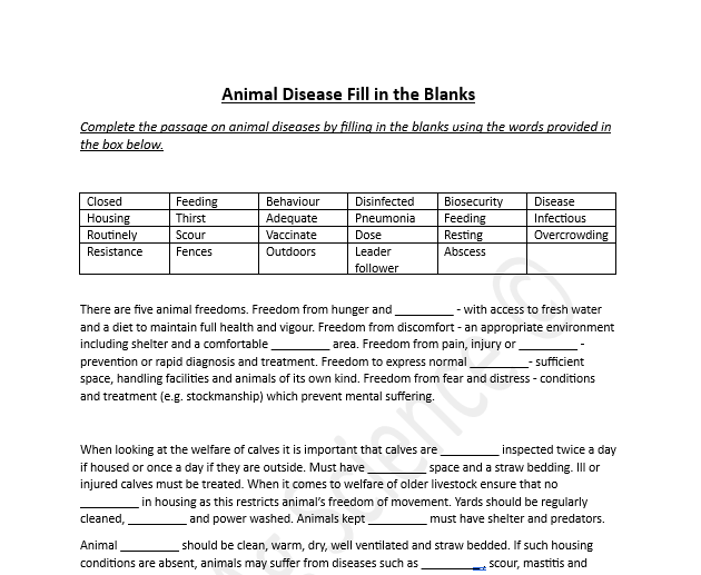 Crossword with 30 questions what looks at animal diseases in cattle, sheep and pigs, types of disease, biosecurity, animal welfare, and much more. Great to highlight key terms from the chapter.