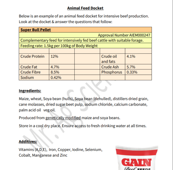 These two worksheets guide students through real-world feed dockets for beef cattle and lambs, exploring nutrient composition, feeding rates, GM crops, and mineral supplementation.