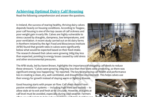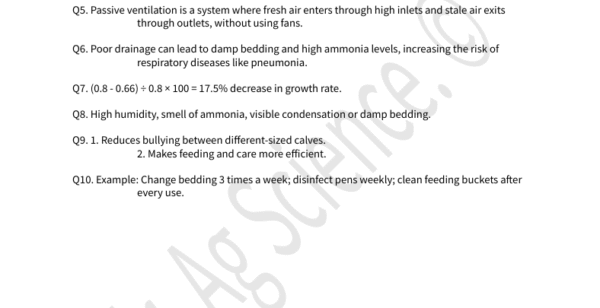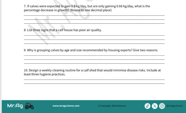 This worksheet contains 10 questions exploring calf housing, animal welfare, environmental factors, and growth rate calculations.
