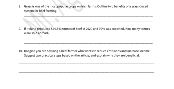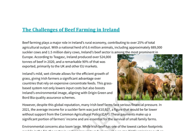 This comprehension resource explores the economic, environmental, and management challenges faced by Irish beef farmers.