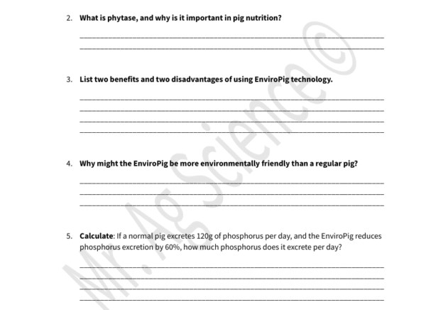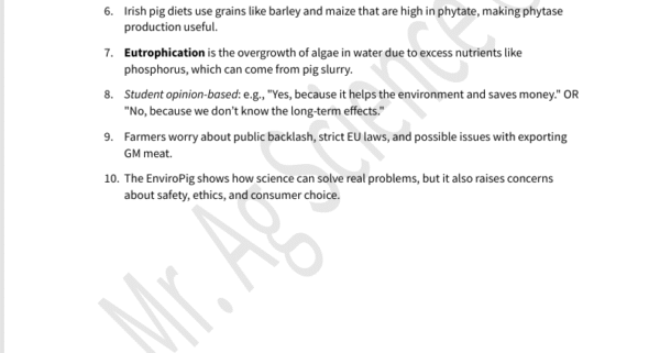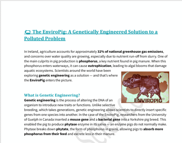 This engaging worksheet introduces students to the fascinating case of the EnviroPig — a genetically engineered pig designed to reduce phosphorus pollution from slurry. With clear, accessible reading material and 10 scaffolded questions (definitions, literacy, numeracy, higher order), students explore the science, ethics, and sustainability issues linked to genetic engineering in agriculture.