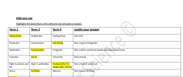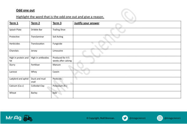 Each question presents three related terms, where students must identify the odd one out and provide a clear justification for their choice.