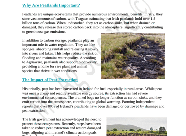 This comprehension resource explores the importance of peatlands in Ireland, highlighting their role as carbon sinks, regulators of water, and habitats for biodiversity.