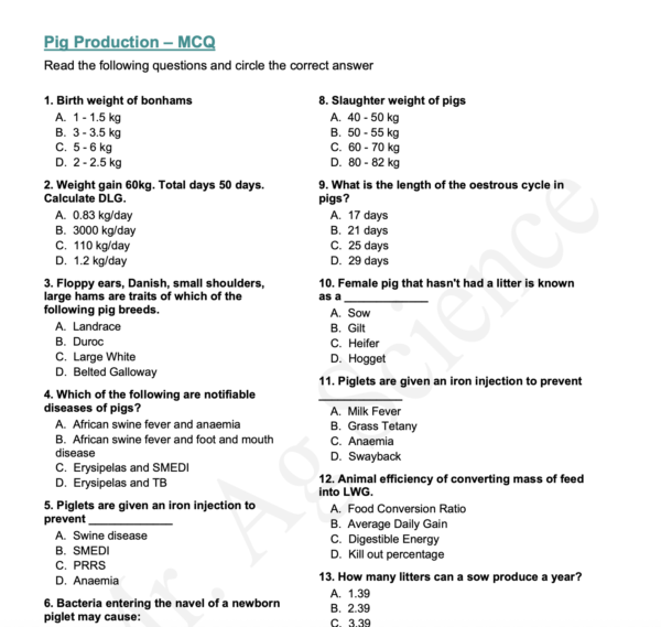 This 24-question multiple choice worksheet covers the key concepts of Pig Production at senior agricultural science level.