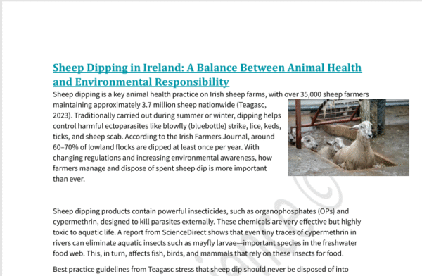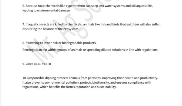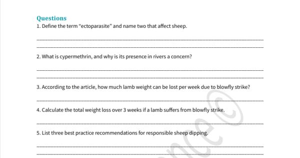 This worksheet contains 10 questions covering sheep ectoparasites, responsible dipping practices, environmental impact, and cost calculations.