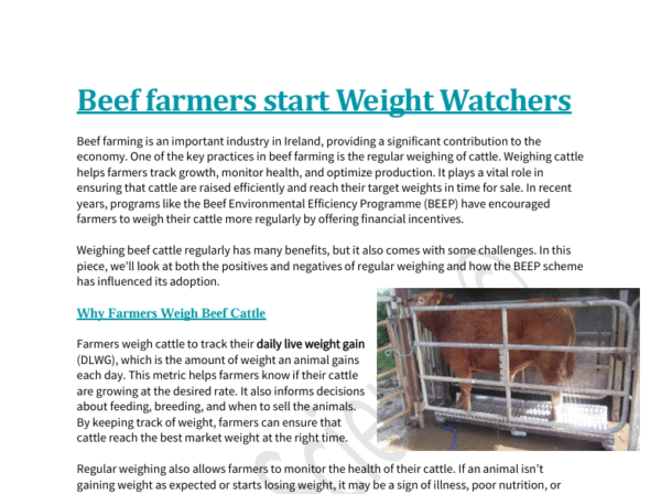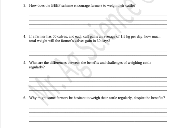This comprehension and numeracy worksheet explores the importance of regularly weighing beef cattle, the role of daily live weight gain (DLWG), and the impact of the Beef Environmental Efficiency Programme (BEEP) in Ireland.